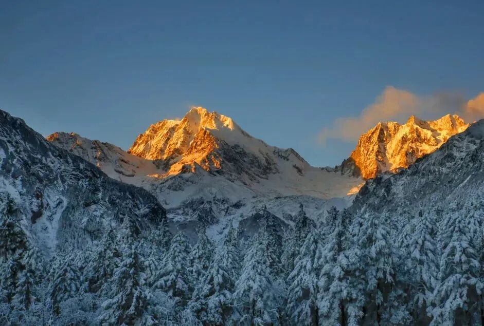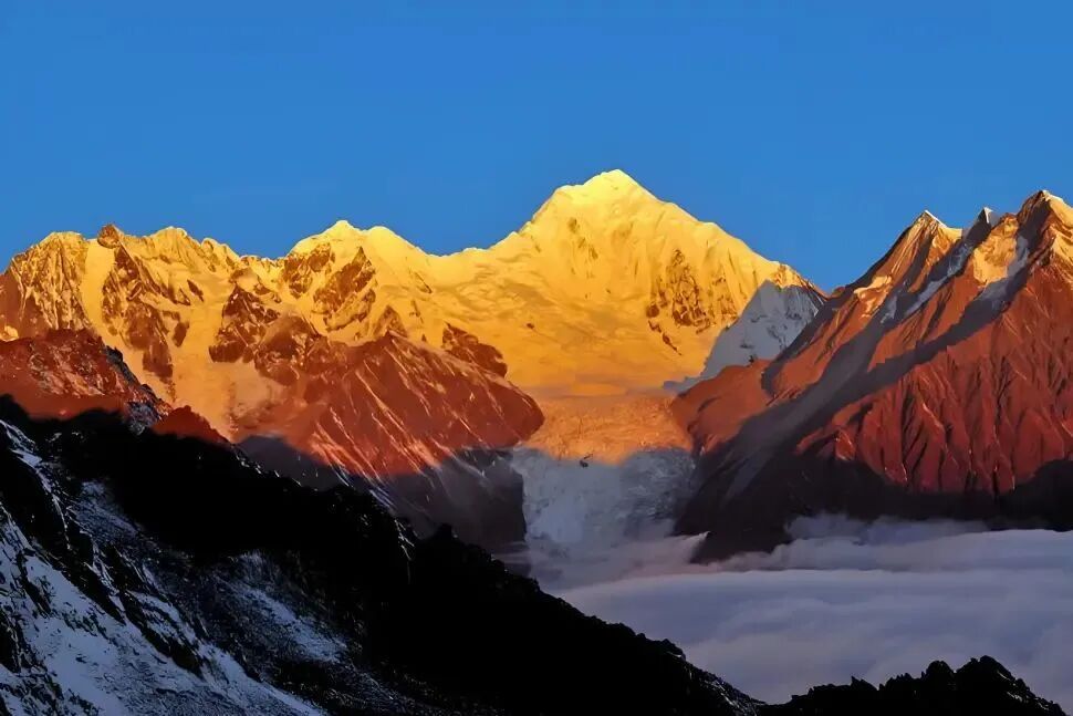 天气晴朗时,晨曦中的贡嘎山主峰会被朝阳染成金色,形成“日照金山”的壮丽景色。由于巨大的海拔高差,海螺沟形成了完整的垂直气候带和植被带,从山谷的亚热带植物到高山的高寒植被应有尽有,被誉为“世界园林之母”