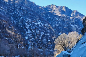 依山而行,峡谷险峭,怪石嶙峋,多处已经结上厚厚的冰,形成了大大小小的冰瀑,千姿百态,美轮美奂。
